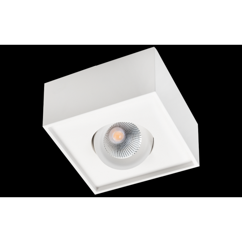 Description: Downlight, LED intérieur plafonnier luminaire montage saillie, blanc, 8W, 3000K. inclinable 30 degrés dans toutes les directions, driver incl., dimmable coupure de phase. Mat.: aluminium, verre transparent. Classe I, IP21, faisceau 42 degrés, Ra>95, SDCM 2
