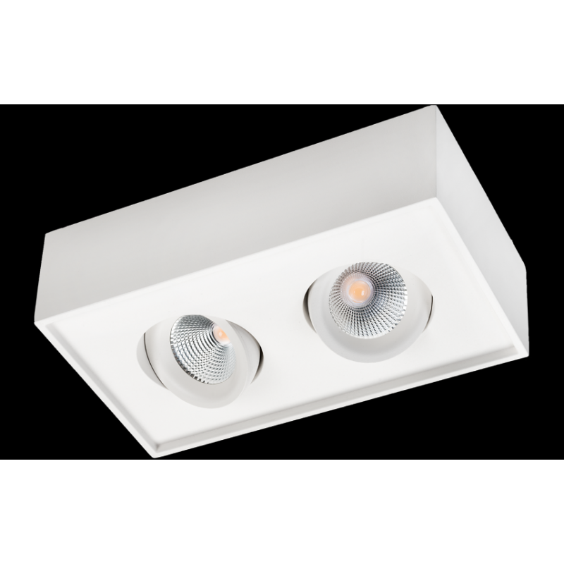Description: Downlight, LED intérieur plafonnier luminaire montage saillie, blanc, 2x8W, 2700K. inclinable 30 degrés dans toutes les directions, driver incl., dimmable coupure de phase. Mat.: aluminium, verre transparent. Classe I, IP21, faisceau 42 degrés, Ra>95, SDCM 2
