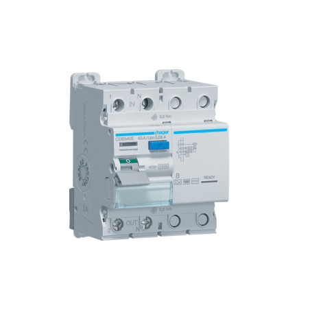 Emballage: 1 - 1 - 33 - 792 Marque: HagerRéférence: CDB540EEAN: 3250611627791Description: Interrupteur différentiel 2P 40A 30mA type B SKR 4M.