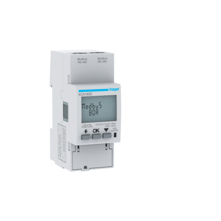 Emballage: 1 - 1 - 36 - 864 Marque: HagerRéférence: ECA180DEAN: 3250612231256Description: Compteur monophasé P+N direct 80A 2M Agardio MID