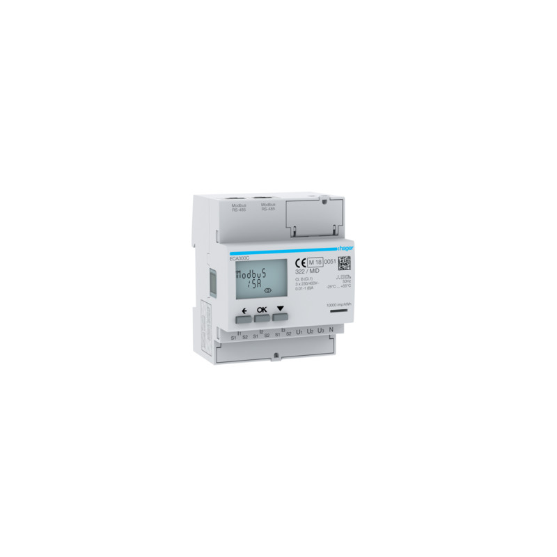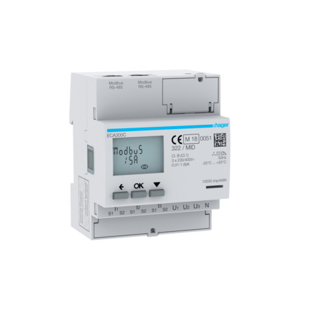 Emballage: 1 - 1 - 24 - 576 Marque: HagerRéférence: ECA300CEAN: 3250612231263Description: Compteur triphasé 3P+N via TI 1-5A 4M Agardio MID
