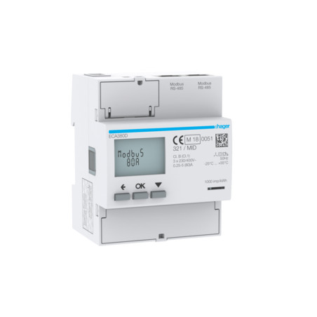 Emballage: 1 - 1 - 24 - 576 Marque: HagerRéférence: ECA380DEAN: 3250612231287Description: Compteur triphasé 3P+N direct 80A 4M Agardio MID