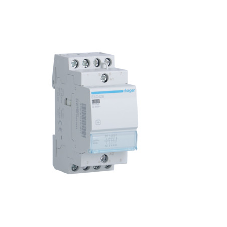 Emballage: 1 - 1 - 60 - 1440 Marque: HagerRéférence: ESC428EAN: 3250612400997Description: Contacteur 4x25A 230V 3NO+1NF 2M.