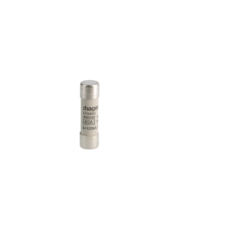 Emballage: 1 - 10 - 1000 - 24000 Marque: HagerRéférence: LF445GEAN: 3250614062582Description: Cartouche-fusible 14x51 gG 45A