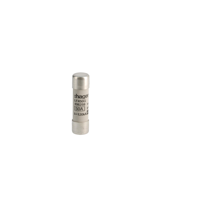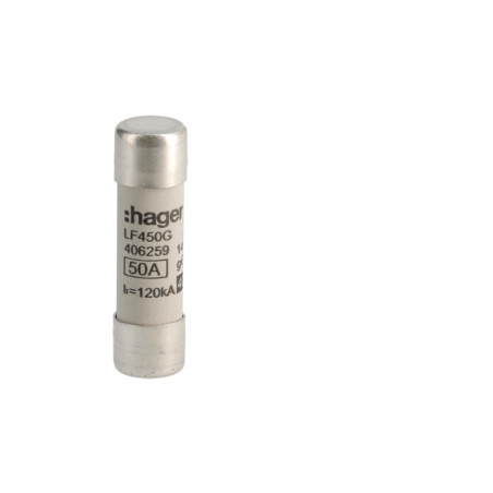 Emballage: 1 - 10 - 1000 - 24000 Marque: HagerRéférence: LF450GEAN: 3250614062599Description: Cartouche-fusible 14x51 gG 50A