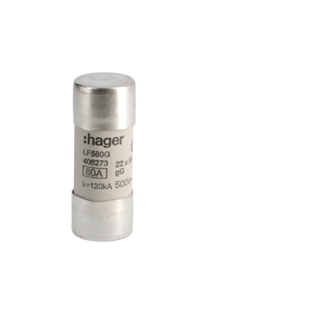 Emballage: 1 - 10 - 300 - 7200 Marque: HagerRéférence: LF580GEAN: 3250614062735Description: Cartouche-fusible 22x58 gG 80A
