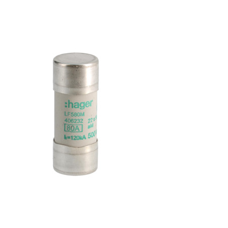 Emballage: 1 - 10 - 300 - 12600 Marque: HagerRéférence: LF580MEAN: 3250614062322Description: Cartouche-fusible 22x58 aM 80A