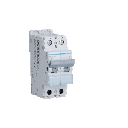 Emballage: 1 - 6 - 72 - 1728 Marque: HagerRéférence: MCA232EAN: 3250614346675Description: Disjoncteur 6kA - C - 2P - 32A - 2M.