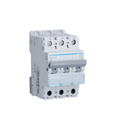 Emballage: 1 - 4 - 48 - 1152 Marque: HagerRéférence: MCA325EAN: 3250614346811Description: Disjoncteur 6kA - C - 3P - 25A - 3M.