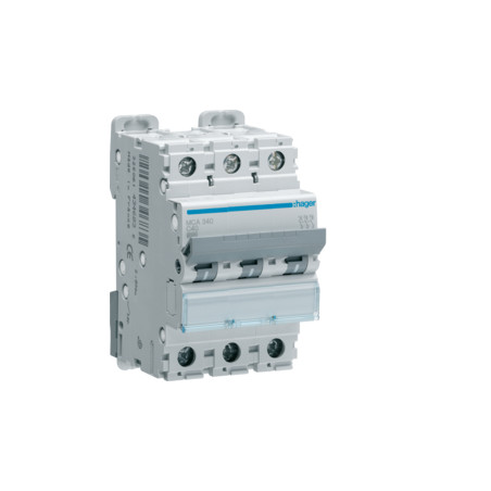 Emballage: 1 - 4 - 48 - 1152 Marque: HagerRéférence: MCA340EAN: 3250614346835Description: Disjoncteur 6kA - C - 3P - 40A - 3M.