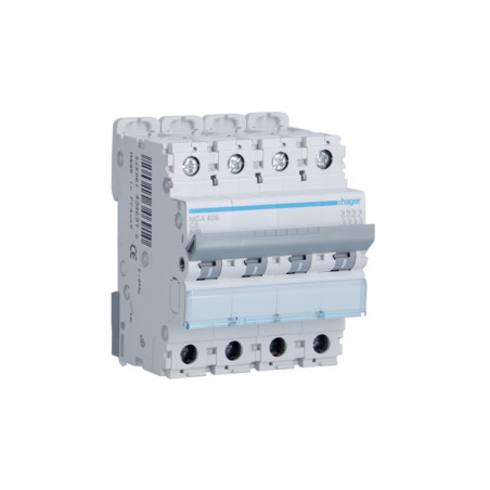 Emballage: 1 - 3 - 36 - 864 Marque: HagerRéférence: MCA406EAN: 3250614346910Description: Disjoncteur 6kA - C - 4P - 6A - 4M.