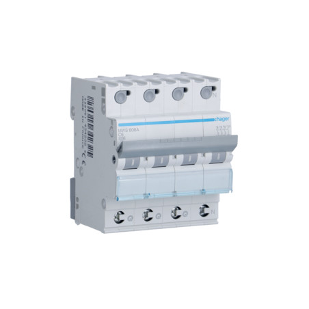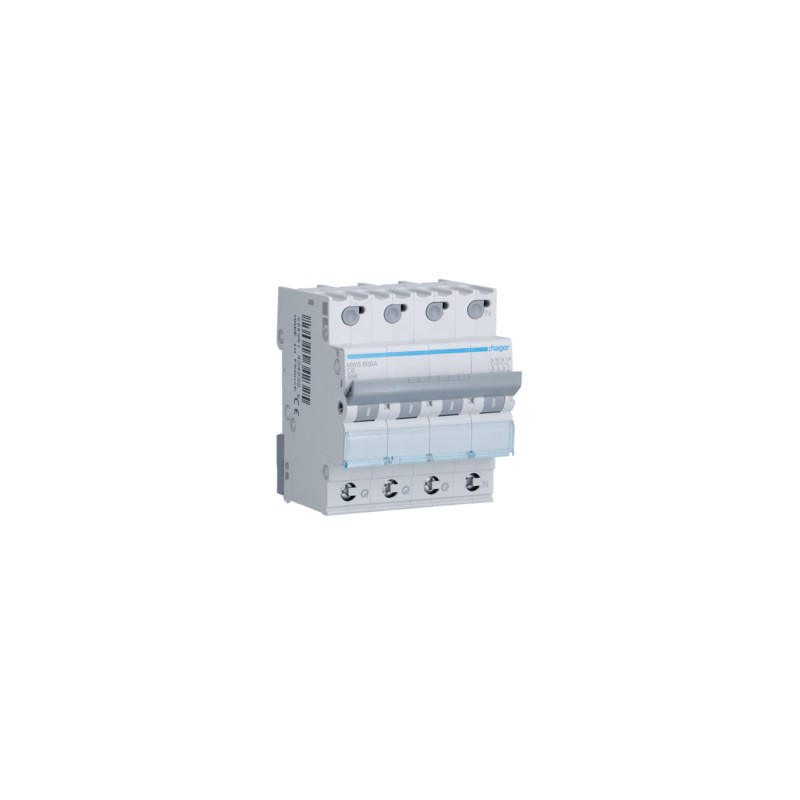 Emballage: 1 - 3 - 36 - 864 Marque: HagerRéférence: MWS606AEAN: 3250614342325Description: Disjoncteur 3kA - C - 3P+N - 6A - 4M. - quickconnect