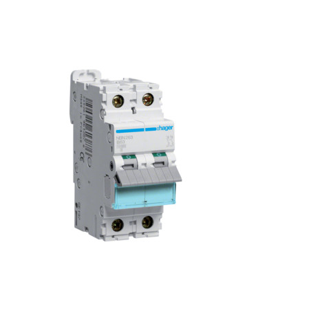Emballage: 1 - 6 - 72 - 1728 Marque: HagerRéférence: NBN263EAN: 3250614613937Description: Disjoncteur 10kA - B - 2P - 63A - 2M.