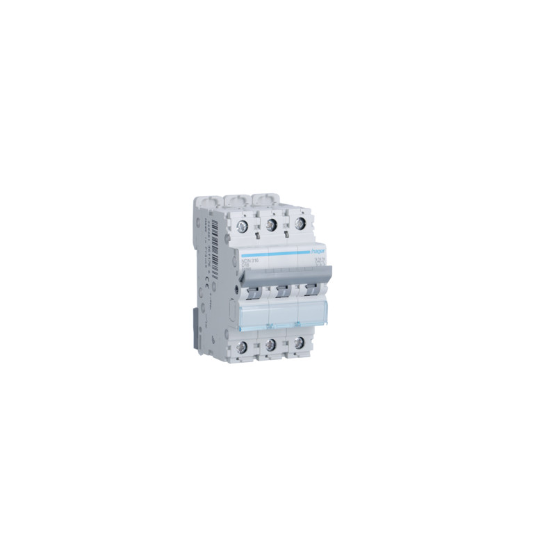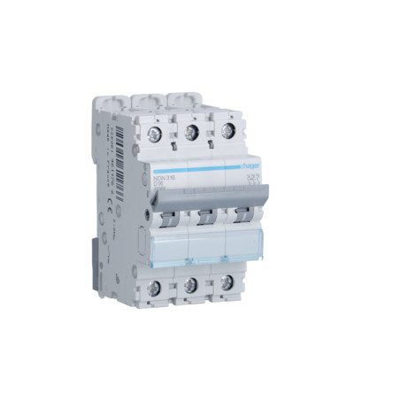 Emballage: 1 - 4 - 48 - 1152 Marque: HagerRéférence: NDN316EAN: 3250614611766Description: Disjoncteur 10kA - D - 3P - 16A - 3M.