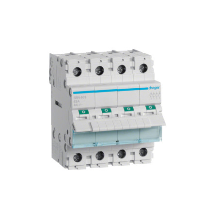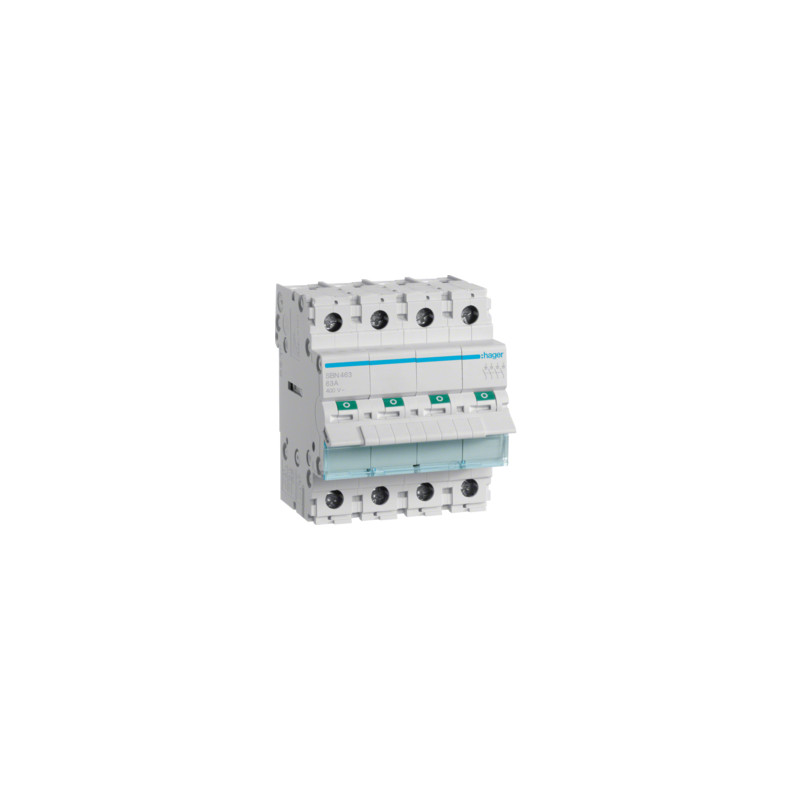 Emballage: 1 - 1 - 36 - 864 Marque: HagerRéférence: SBN463EAN: 3250615510235Description: Interrupteur modulaire 4 pôles 63A