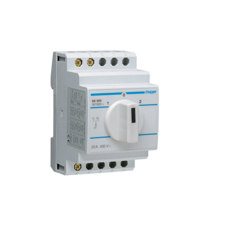Emballage: 1 - 1 - 48 - 1152 Marque: HagerRéférence: SK601EAN: 3250615616012Description: Commutateur inverseur - 2P - 20A - 400V