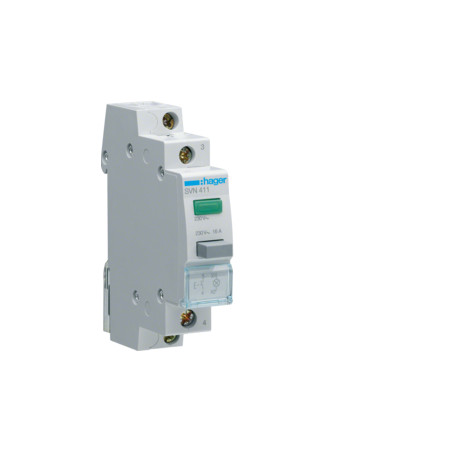 Emballage: 1 - 12 - 144 - 3456 Marque: HagerRéférence: SVN411EAN: 3250615721921Description: Bouton-poussoir à impulsion + voyant 1NO 16A 1M.