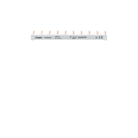 Emballage: 1 - 5 - 200 - 4800 Marque: HagerRéférence: TGM620DEAN: 3250615879776Description: Barres de pontage pr TXM620D (2 pièces)