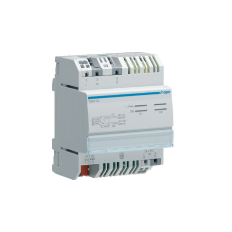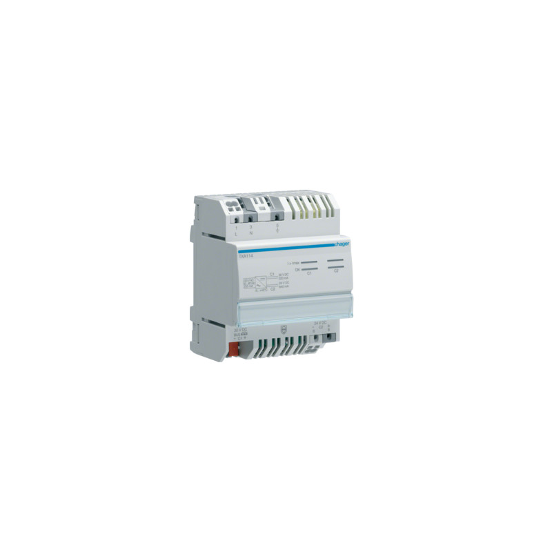 Emballage: 1 - 1 - 36 - 864 Marque: HagerRéférence: TXA114EAN: 3250616048997Description: Alimentation Bus 1x30V TBTS + 1x24V
