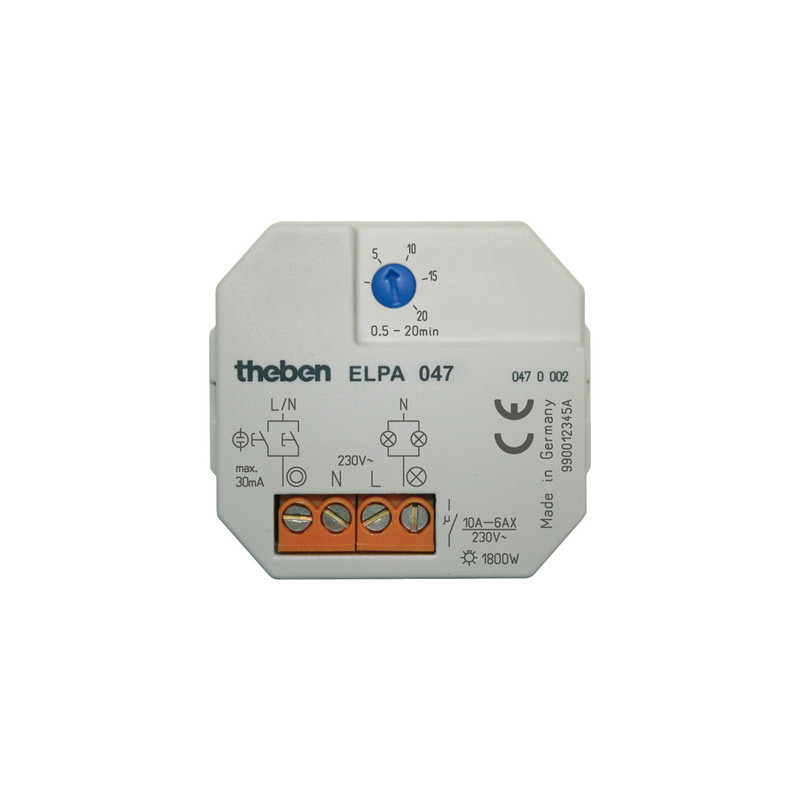 Emballage: 1Référence: ELPA 047Marque: THEBENRéférence fabricant: 0470002EAN: 4003468047002Description: MINUTERIE D'ESCALIER À ENCASTRER 230V 50-60HZ 0,5-20M 1NO 8A