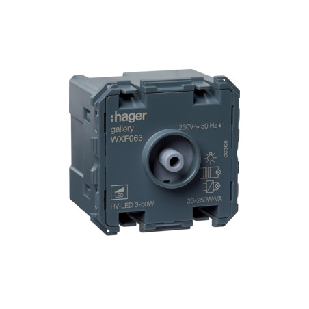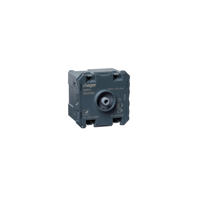 Emballage: 1 - 1 - 36 - 1152 Marque: HagerRéférence: WXF063EAN: 3250617192880Description: Variateur à touche 250W