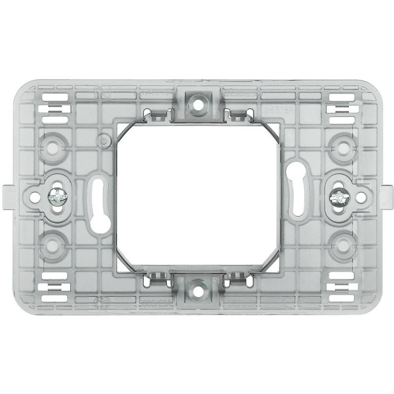 Emballage: 50 - 50 - 2500 Marque: BticinoRéférence: 503S/2AEAN: 8012199496504Description: Support Magic - pour 2 modules (carré) - à vis