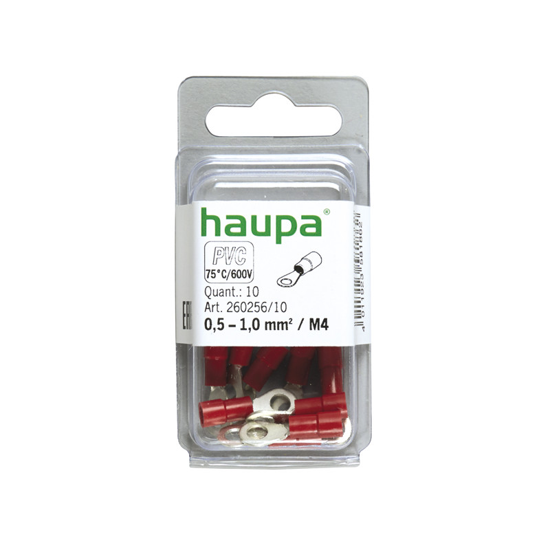 Emballage: 10Marque: HaupaRéférence: 260256/10EAN: Description: COSSE A SERTIR 0,5-1,0 M4 rg