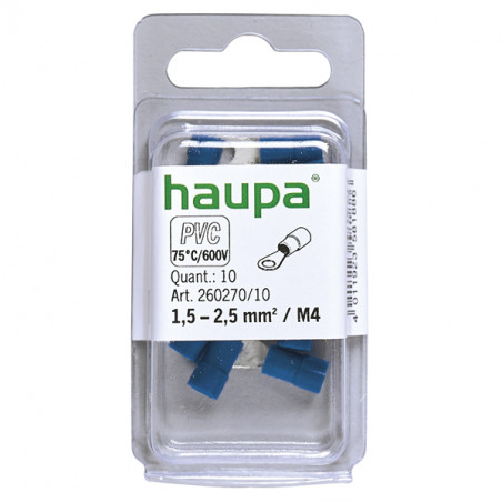 Emballage: 10Marque: HaupaRéférence: 260270/10EAN: Description: COSSE A SERTIR 1,5-2,5 M4 bl