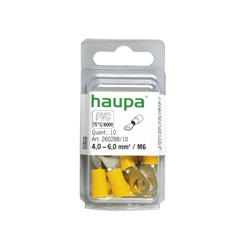 Emballage: 10Marque: HaupaRéférence: 260288/10EAN: Description: COSSE A SERTIR 4,0-6,0 M6 jn
