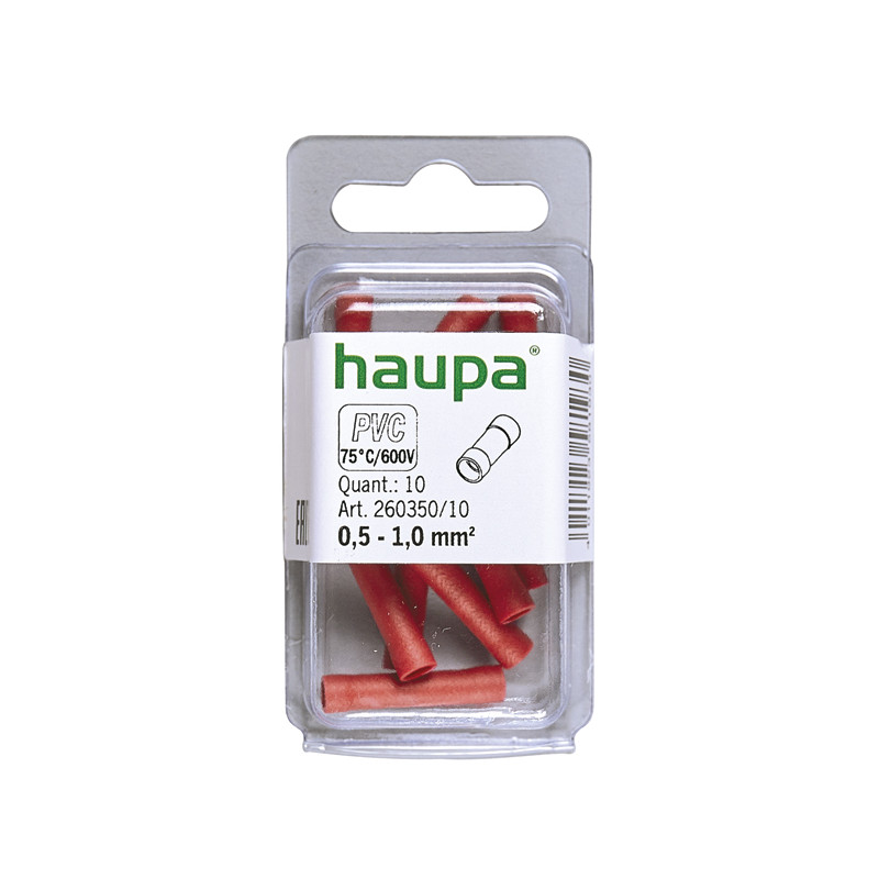 Emballage: 10Marque: HaupaRéférence: 260350/10EAN: Description: MANCHON A SERTIR 0,5-1,0 rg
