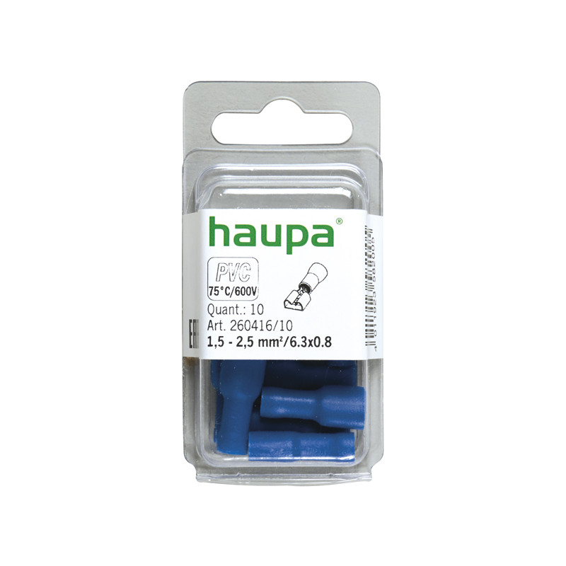 Emballage: 10Marque: HaupaRéférence: 260416/10EAN: Description: CLIPS A SERTIR BL 1,5-2,5/6,3x0,8 bl