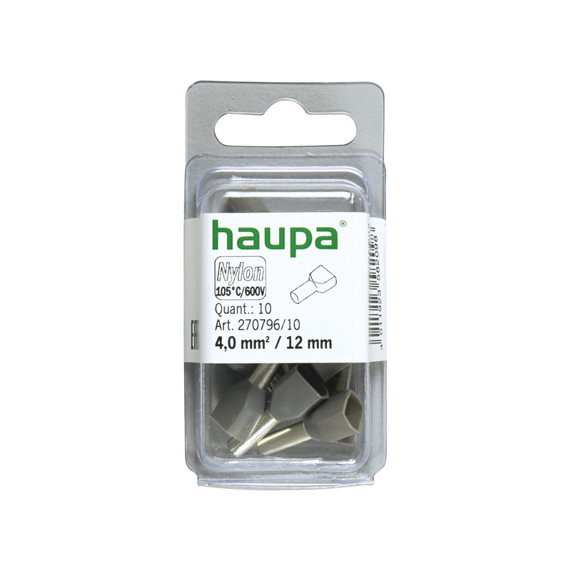 Emballage: 10Marque: HaupaRéférence: 270796/10EAN: Description: EMBOUTS 4,0/12,0mm gris