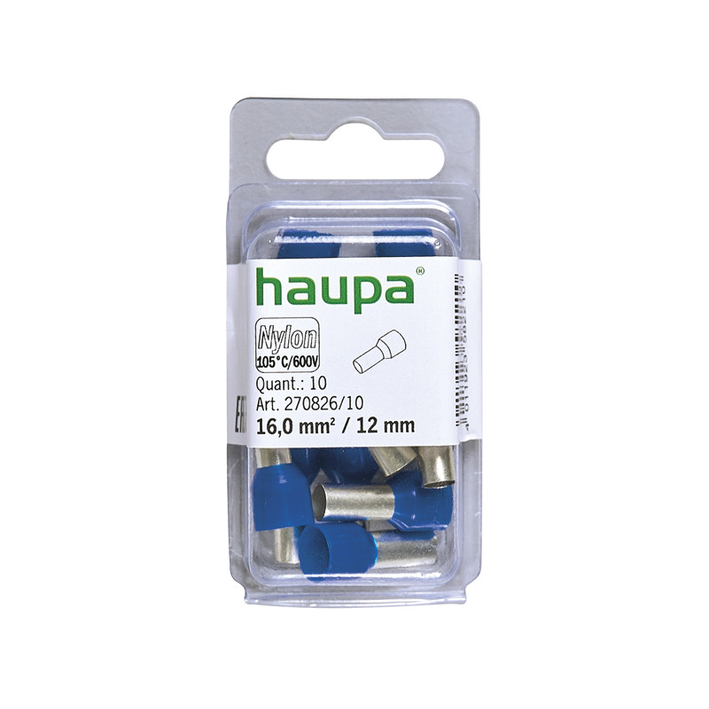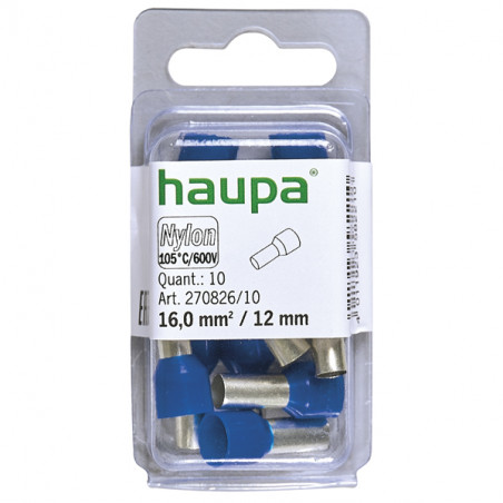 Emballage: 10Marque: HaupaRéférence: 270826/10EAN: Description: EMBOUTS ISOL.16/12 bleu