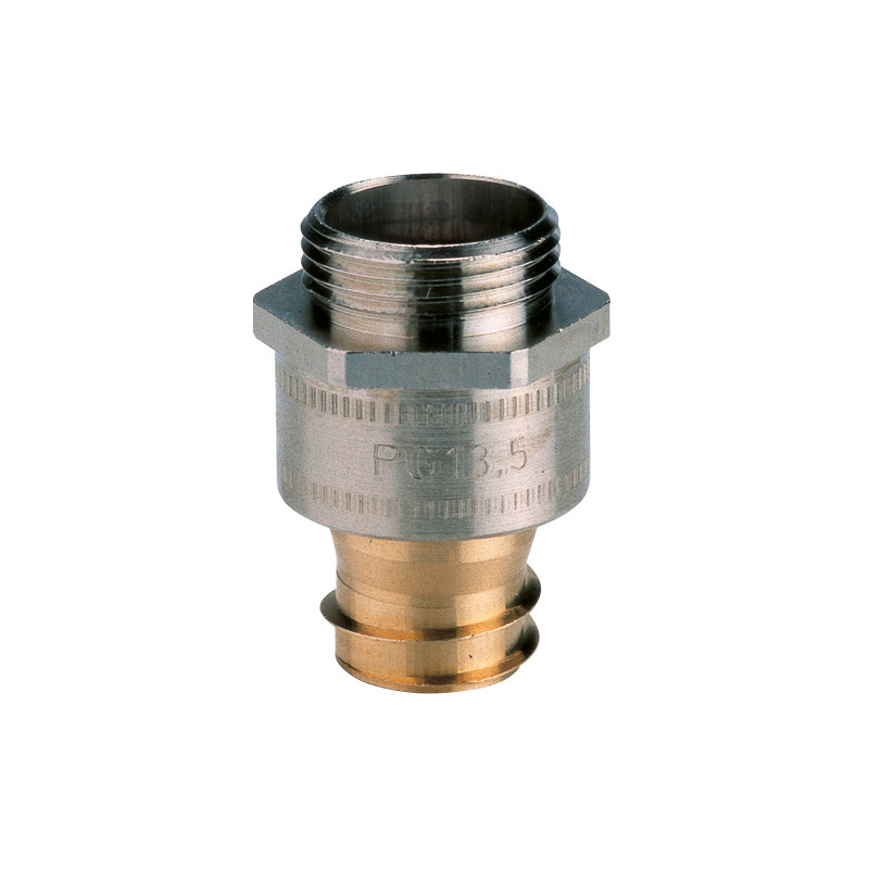 Description: LI-M. Connecteur en métal, droit, filetage extérieur, douille fixe, orientable. - laiton nickelé - embout en laiton poli - circlip en acier à ressort - M 25 x 1,5 Ø 27 - IP40 -