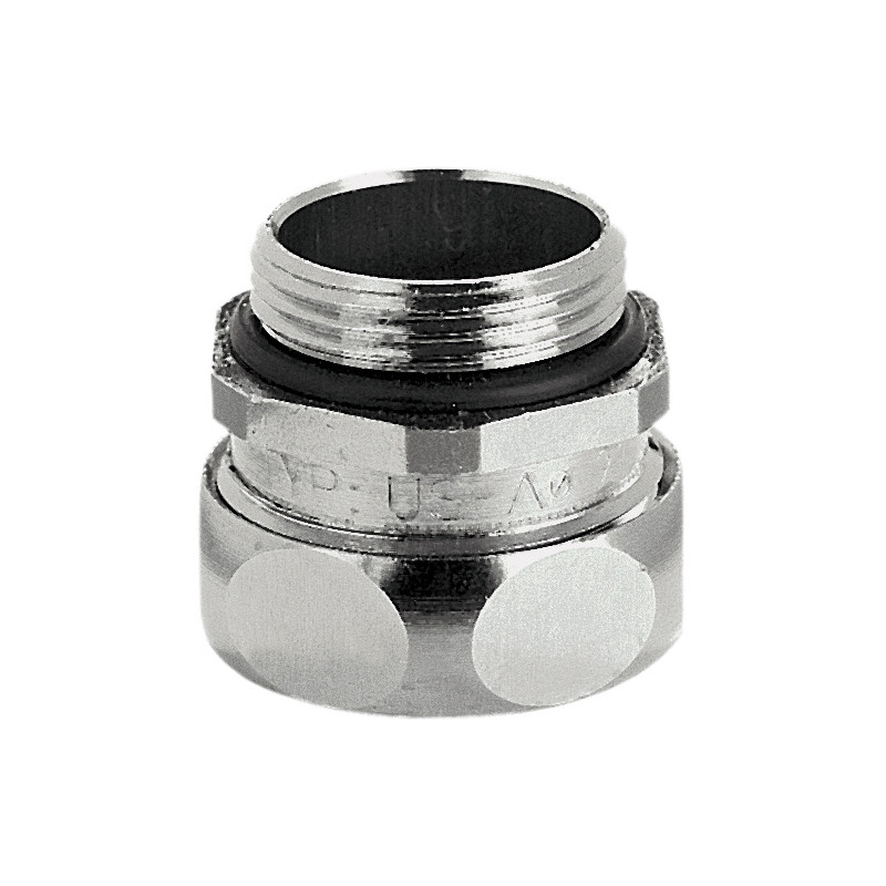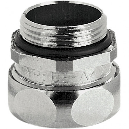 Description: US-P. Raccord métallique, type de sécurité, droit, filetage extérieur. - laiton nickelé - bague d'étanchéité: TPE ou en PTFE - joint torique: NBR - PG 9 - IP40 -