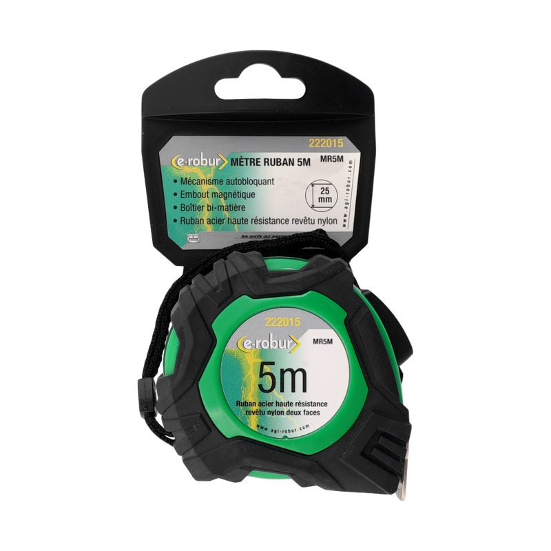 Description: Mètre ruban acier enrobé de nylon longueur 5 m autobloquant, boitier bimatière