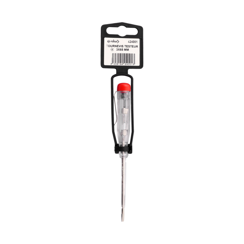 Emballage: 1 Marque: E-RoburRéférence: 424001EAN: 3508194240013Description: Tournevis testeur 3x65 mmhttps://teconex.eu/fr/produit/ac571a0a-9414-1b40-8d0f-ad68fb4a9283