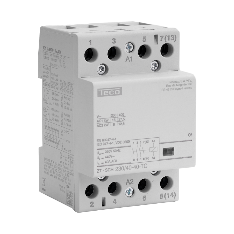 Emballage: Marque: TeconexRéférence: Z7SCH2304040EAN: 4015082857301Description: Contacteur Teco 230VAC 40A 4NOhttps://teconex.eu/fr/produit/51dd3fe8-e5bb-1940-b981-94027a103efa