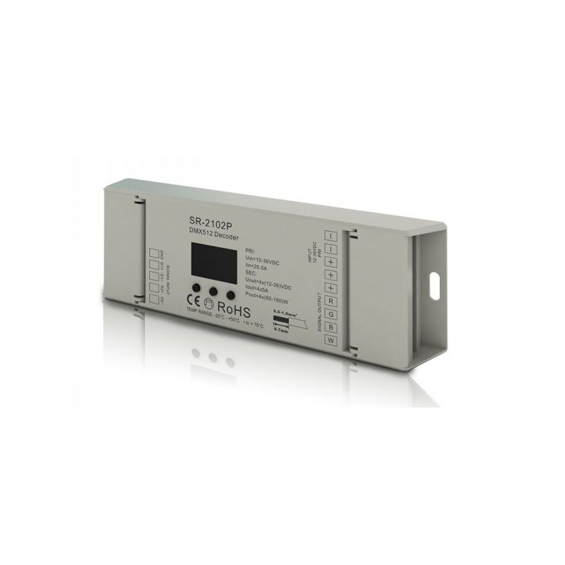 Emballage: 1 - 80Marque: IntegratechRéférence: SR-2102PEAN: 5420076208233Description: Contrôleur DMX à PWM RGB(W) 4x5A