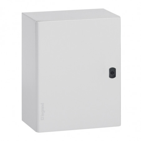 Description: Coffret métallique Atlantic dimenion (h x l x p) 500 x 400 x 250 mm - IP 55 - IK 10 - RAL 7035 - poids 10,7 kg - porte réversible - livré avec acc. de fix. équip.