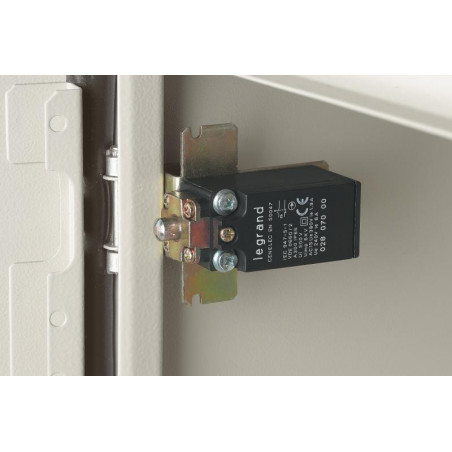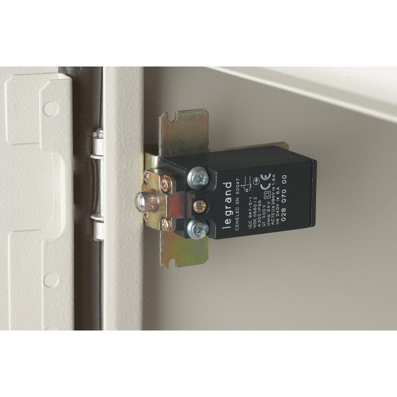 Description: Contact de porte - 250 V - 6 A - 1 contact NF - 1 contact NO - pour coffrets métalliques Atlantic - livré avec patte de fixation