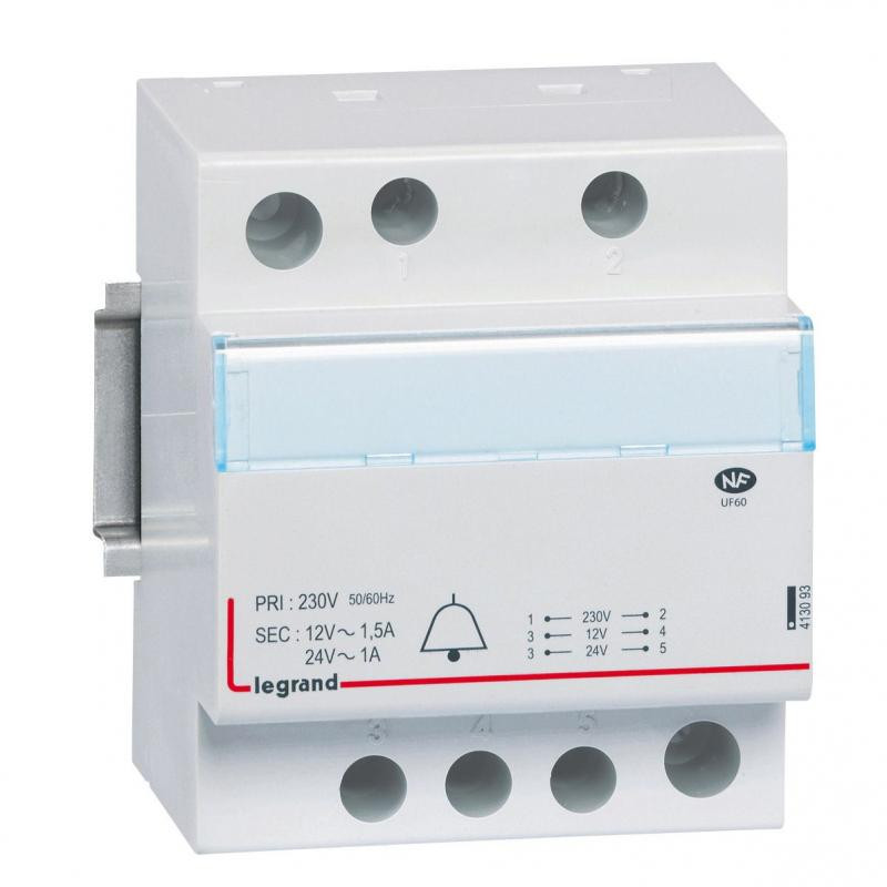 Emballage: 1 - 15 - 150 Marque: LegrandRéférence: 413093EAN: 3245064130936Description: Transformateur sonnette 24/12V - 24-18VA 1/1.5A - 4 modules