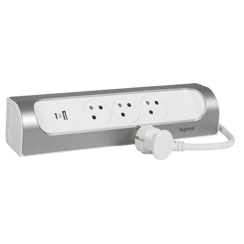 Description: Prise multiple montable 3x2P+T USB-A + USB-C et 1m de câble. Peut être placé dans un angle de 90° - alu