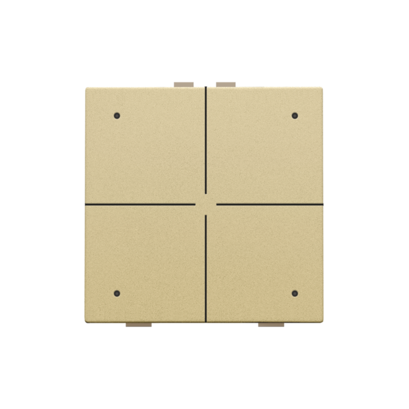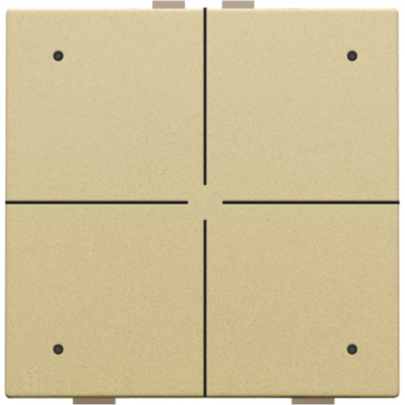 Emballage: 1 - 6 Marque: Niko Référence: 221-52004 EAN: 5413736323841 Description: Bouton-poussoir quadruple avec LED pour Niko Home Control, couleur gold coated Couleur: Pure alu gold