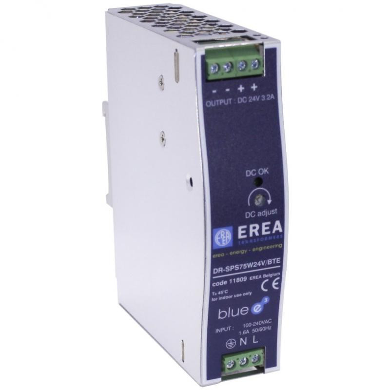 Emballage: 1 Marque: Erea Référence: DR-SPS75W24V/BTE ID article: 11809 EAN: 5414503118097 Description: Alim à découpage DC - 230V AC // 24V DC In 3,2A - P 75W -rail-DIN