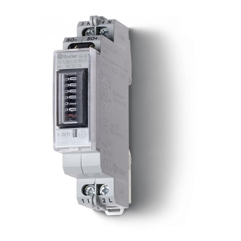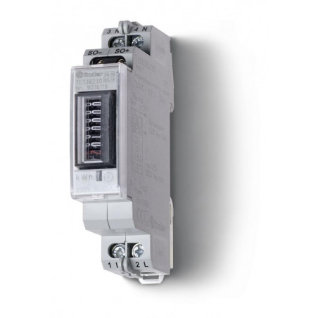 Description: Compteur d'énergie momophasé, modulaire 5A nominal 32A maximum, 230V AC, sortie émettrice d'impulsions SO +/-, affichage vertical, classe 1/B, certifié MID