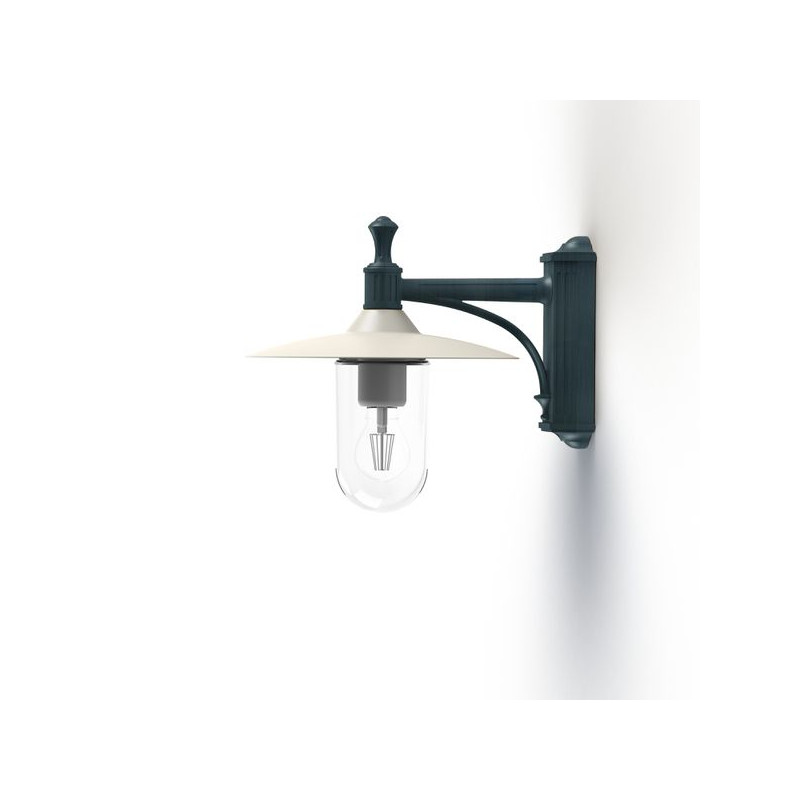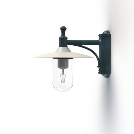 Applique descendante MONTANA en aluminium, E27, IP44, classe 1, diffuseur verre clair. Potence Finition Patine vert de gris 008, dôme blanc. Garantie 25 ans ant