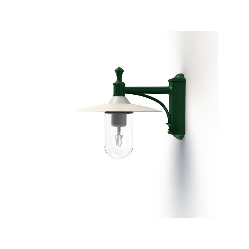 Applique descendante MONTANA en aluminium, E27, IP44, classe 1, diffuseur verre clair. Potence Teinte RAL 6009 Vert anglais 019, dôme blanc. Garantie 25 ans ant