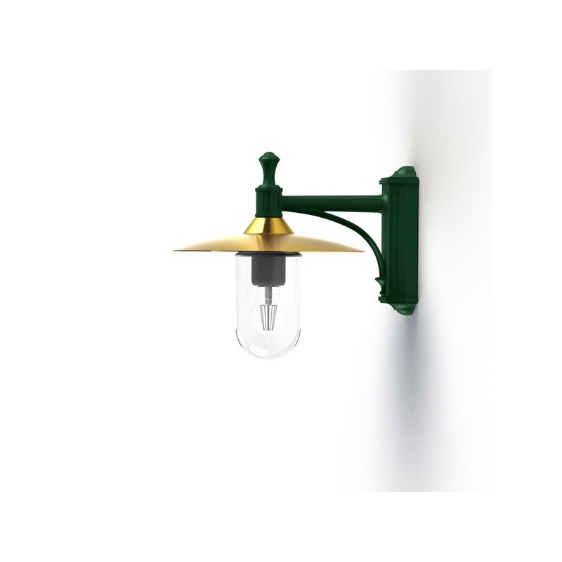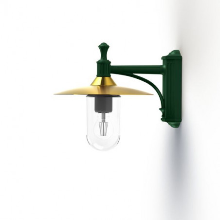 Applique descendante MONTANA, E27, IP44, classe 1, diffuseur verre clair. Potence Teinte RAL 6009 Vert anglais 019, dôme en cuivre vernis