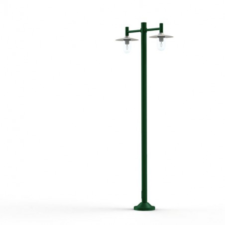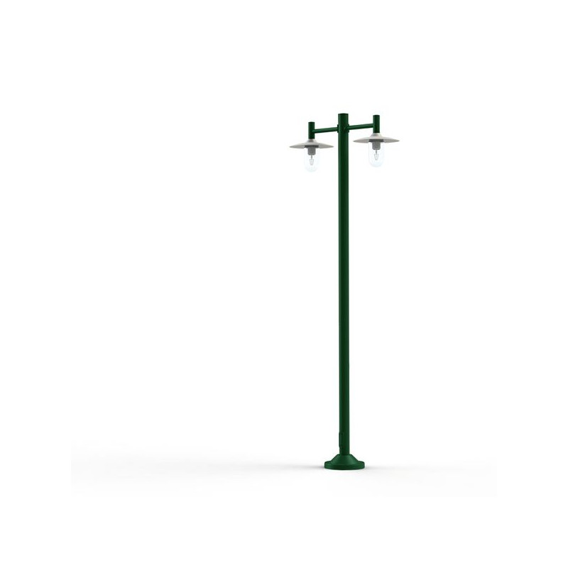 Lampadaire 2 têtes MONTANA en aluminium, E27, IP44, classe 1, diffuseurs verres clairs. Mât, bras Teinte RAL 6009 Vert anglais 019, dômes en blanc. Garantie 25